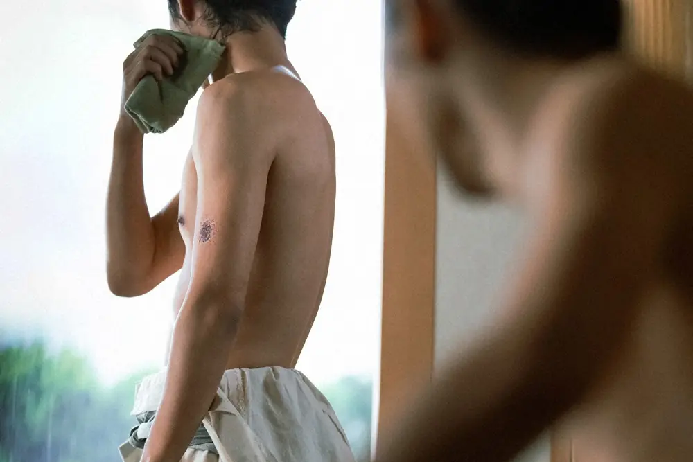 大河ドラマ「光る君へ」第7話。打毬の後、突然の雨に打たれた直秀(毎熊克哉・奥)の左腕には…(C)NHK