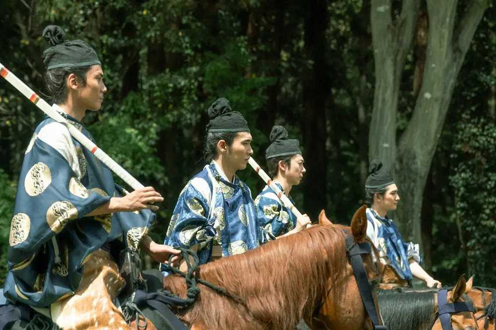 大河ドラマ「光る君へ」第7話。打毬に臨む(手前から)直秀(毎熊克哉)藤原道長(柄本佑)藤原斉信(金田哲)藤原公任(町田啓太)(C)NHK