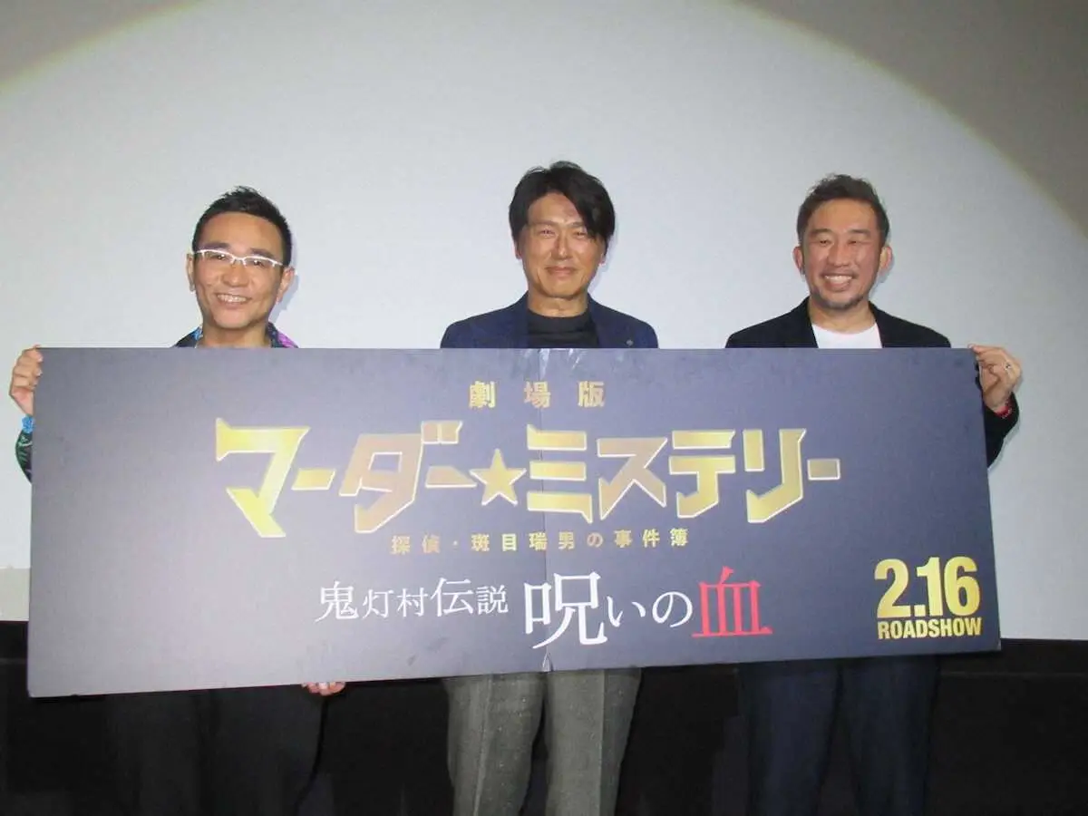 「劇場版 マーダー★ミステリー 探偵・斑目瑞男の事件簿 鬼灯村伝説 呪いの血」の舞台あいさつに登場した(左から)八嶋智人、高橋克典、光岡麦監督