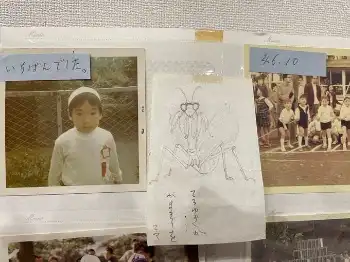 「それではなくて、問題はその横の(『てるゆきが…カマキリを ママ』はまあいいとして)、5歳10ヶ月にしてもう私がカマキリを仔細に捉えたスケッチを描き添えていることだ。執拗な執念の萌芽が早くもそこに見て取れる。つまりこの頃からすでに私は、カマキリの魅力に深く捉えられているのだった」と、自身が描いた絵を披露し「…ちなみに私が、カマキリの被り物をして人前に出るのは、わずかその45年後のことである」とつづっていた。