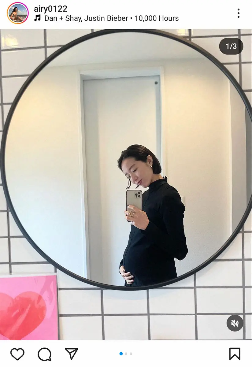 アイリは「この度、お腹に愛おしい命を授かりました。現在妊娠9ヶ月で、桜が咲く頃に家族が増えます」とつづり、ふっくらとしたお腹に愛おしそうに手を当てる写真を投稿した。アイリは21年10月に結婚を発表している。