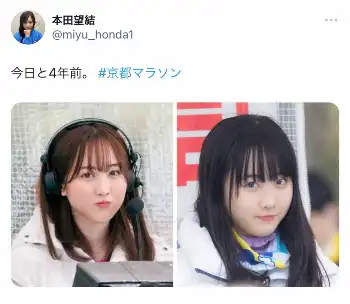 「今日と4年前」と“京都マラソン”の会場で実況をしている4年前の自分と現在の自分の写真を投稿。