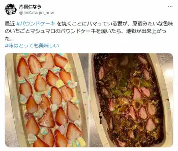 片桐は「最近パウンドケーキを焼くことにハマっている妻が」と切り出し、「原宿みたいな色味のいちごとマシュマロのパウンドケーキを焼いたら、地獄が出来上がった…」と報告した。