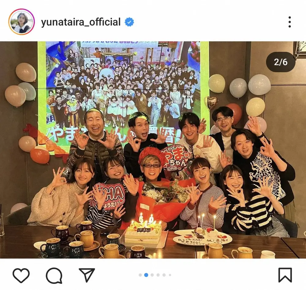 「2年越しでやまちゃんの還暦をお祝いできましたー!!!イワーイさんの結婚も」と書き出すと、かつて同番組に出演していた声優の山寺宏一、俳優の中川大志、お笑いコンビ「ハライチ」や元モーニング娘。で女優の久住小春、自身らが「おっはー」ポーズを決める集合ショットをアップ。