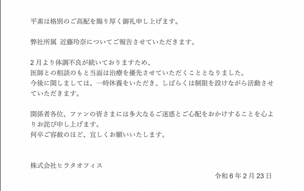 近藤玲奈公式ツイッター(@reina_kondo)から アイマス声優・近藤玲奈が一時休養 体調不良続き、制限設け活動へ 「ご… ギャラリーで見る この記事のフォト 2024年02月23日の画像一覧 もっと見る 2024年02月23日の画像をもっと見る
