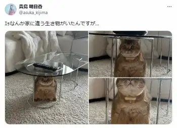 貴島は「エッなんか家に違う生き物がいたんですが…」と報告。ガラステーブルの下でずんぐりと縮んだ愛猫の姿を公開した。
