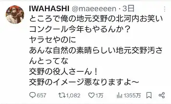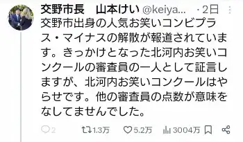 元お笑いコンビ「プラス・マイナス」の岩橋良昌(45)がSNSで大阪府交野市の「北河内新人お笑いコンクール」についてやらせ疑惑を告発し、昨年の第3回大会決勝で審査委員を務めた同市の山本景市長が疑惑を認める投稿を行ったことで波紋が広がっている。これに対して主催の同市商業連合会と、審査委員長を務めた構成作家は全面否定。言い分が真っ向から食い違う形になっている。
