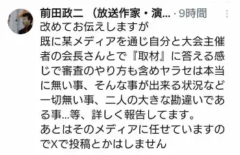 岩橋の告発を受け、山本市長が「審査員を務めましたが、“ヤラセやのに”は真実です」などと投稿。「他の審査員の点数が意味をなしてませんでした」とも指摘した。本紙の取材に応じた山本市長は審査結果について、企画・プロデュース、審査員長を務めていた構成作家の前田政二氏が「1人で集計していた」と説明。そのため「他の審査員が何点つけたかを私は知らないし、逆に他の審査員は私がつけた点数を知らない」と話した。