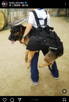 そして、「大型犬移動用のショルダー。瓦礫、山野などで思わぬ怪我をした時に使用する物 ポータブルシャワー 4個 救急箱 そしてその他、おやつやガムなども沢山購入していただけるようにお願いしました https://sar-dog-cwc.com/ @sardogc.w.c」と、それぞれの品の写真を添付した。