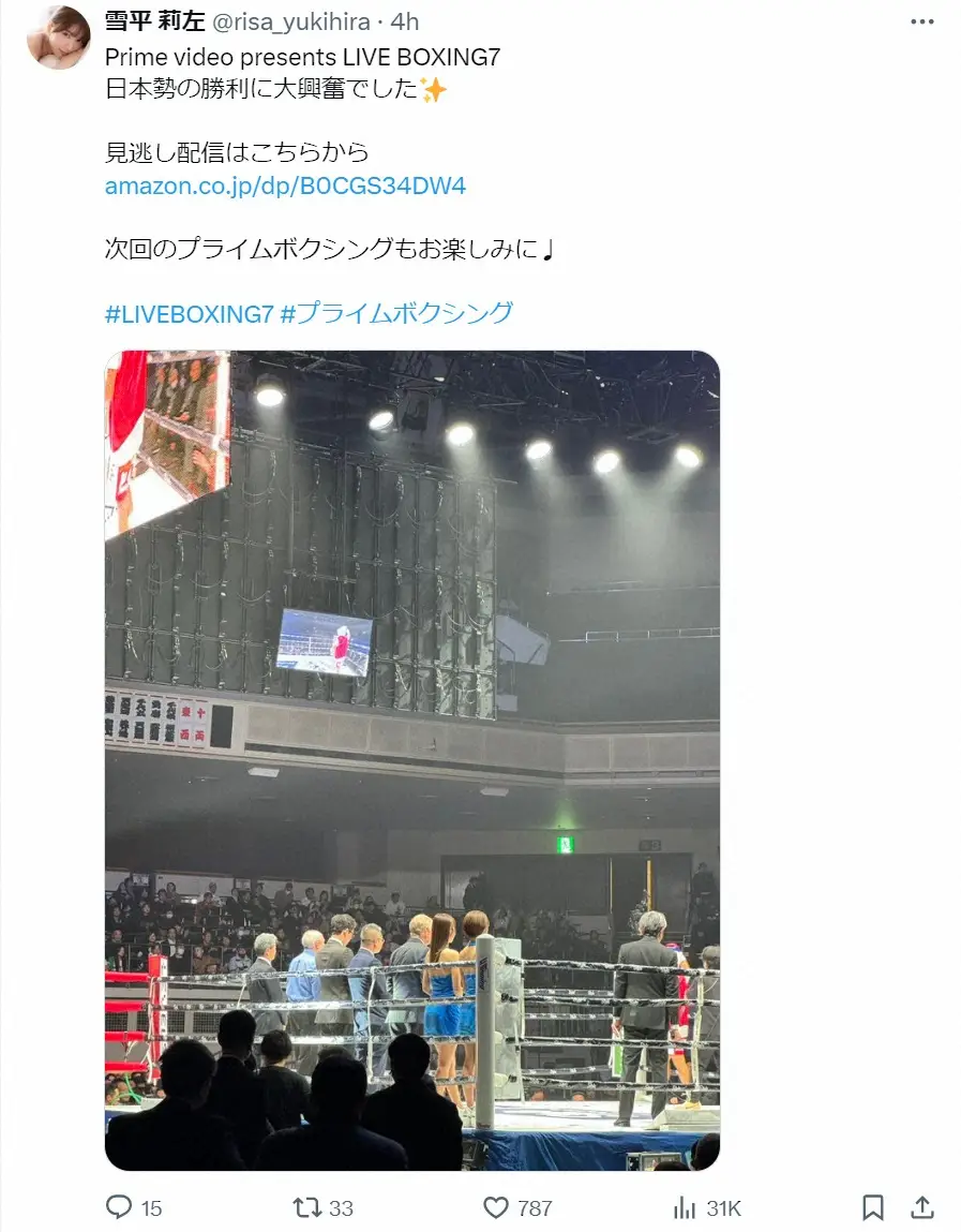グラビアアイドルの雪平莉左(29)が25日、自身のSNSを更新。24日夜に東京・両国国技館で開催されたプロボクシングのトリプル世界戦でリングガールを務めたことを報告した。