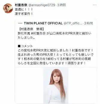 村重が所属する「TWIN PLANET」は26日、公式ホームページで「弊社所属村重杏奈が山口県和木町PR大使に就任いたしました」と発表し、「この度和木町PR大使に就任しました!村重杏奈です!生まれ育った町のPR大使!とってもとっても嬉しいです!和木町の魅力を1番知ってる村重が和木町の素晴らしさを全国に発信していきます!頑張ります!」と村重のコメントも紹介している。