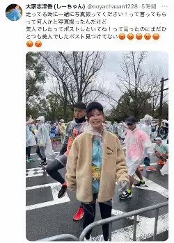 続けて、「走ってる時に一緒に写真撮ってください!って言ってもらって何人かと写真撮った」大家は、「美人でしたってポストしといてね!って言った」という。
