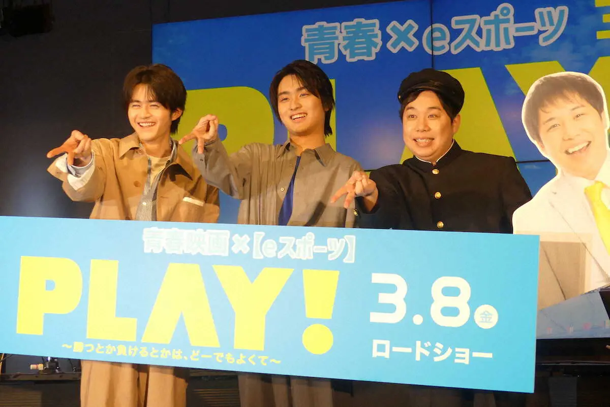 俳優の奥平大兼(20)が27日、都内で映画「PLAY! ~勝つとか負けるとかは、どーでもよくて~」(監督古厩智之)の公開直前イベントに登場。ダブル主演する鈴鹿央士(24)とチームを組み、劇中で描いた「eスポーツ」のひとつ「ロケットゲーム」に挑戦した。