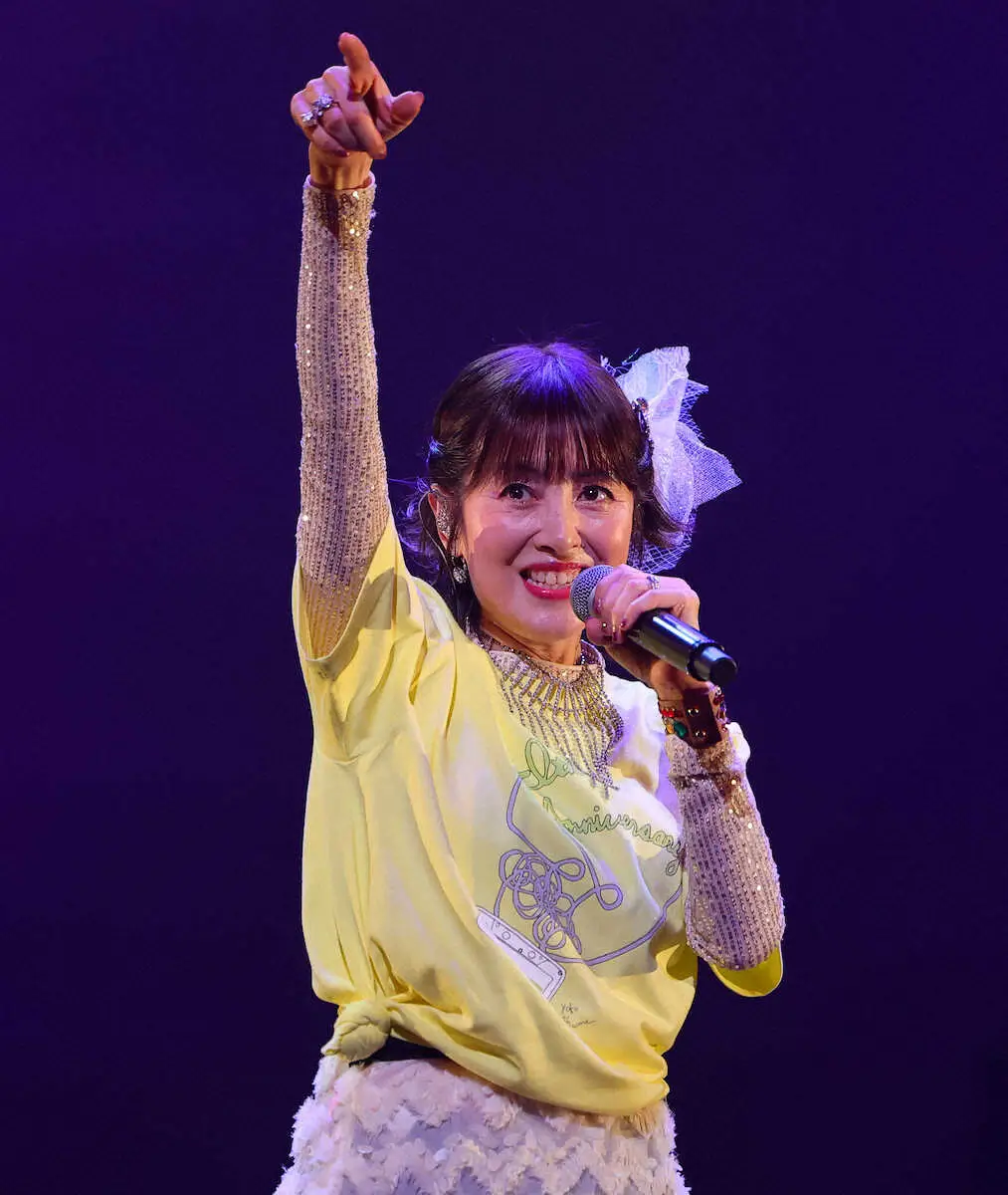 ヒールブーツで舞台を縦横無尽に駆け、踊った。ユーロビートで疾走感あふれるナンバーの数々を歌いこなし「楽しんでる!?」とあおると、集まった1900人のファンは大歓声。拳を力強く突き上げ「洋子ちゃん!」の声援が飛んだ。ヒット曲「ダンシング・ヒーロー」では、タレントの平野ノラ(45)とLiLiCo(53)がゲストで登場。さらにMAXも現れ、ド派手なステージに。ヒット曲「六本木純情派」など全27曲を歌唱した。
