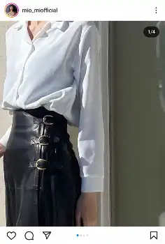 美緒は「私が生まれる前に母が買ったスカート。クローゼットの奥に隠れていたのを発見し履いてみました ウエスト部分をベルトで留めるタイプの巻きスカート!素敵すぎる…!」とつづり、黒革のロングスカート姿を投稿。