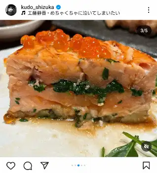 工藤は「メインはサーモン!!テーマはいくらの脱走」とつづり、1番下につぶした焼き芋、サーモン、茹でてバター醤油で味付けしたほうれん草、そしてサーモン。型に入れて上下をフライパンで焼きます」と紹介。