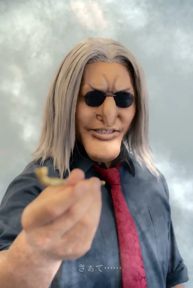 造型に関しては、今回の場合は付け鼻とあごです。知り合いに本職の特殊メークの方がおり、簡単なやり方を少し教えていただき作りました。ソファーなどのクッション材(ハンズ等で購入)をベースにし、少し大きめで形を作り、スポーツ用の伸縮性テープ(肌色)を継ぎ目が目立たないように表面に貼り、その上から液体ゴムで何層も少しづつ塗り付け肌感を出します(この時ゴムが乾いて縮むことを考慮しないと作り直しです)。