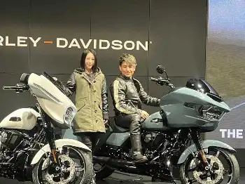 ハーレーダビットソン新型モデルに乗る(左から)矢沢心、魔裟斗(撮影・塩野 遥寿)