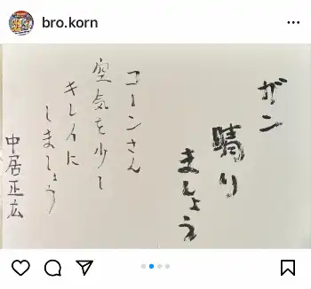 コーンは「中居正広からお見舞いが届きました。笑 ダイキンの空気清浄機と手紙」と中居からのお見舞いの品を公開。「ガン晴りましょう コーンさん 空気を少しキレイにしましょう 中居正広」と直筆のメッセージも披露した。