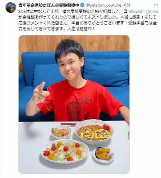 ゆたぼんはこの日「SNS休止中なんですが、僕の高校受験の合格を祈願して、母が合格飯を作ってくれたので嬉しくてポストしました。本当に感謝!」と投稿。母がつくってくれた「合格」と書かれた料理の写真を披露。「そして応援コメントくれた皆さん、本当にありがとうございます!受験本番では全力を出してきってきます。人生は勉強や!」とつづった。