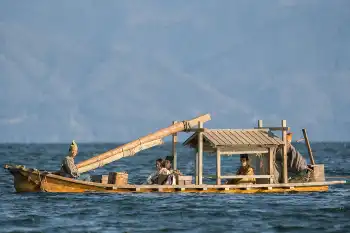 大河ドラマ「光る君へ」の琵琶湖ロケを行った吉高由里子(左から2人目)と岸谷五朗(左から4人目)。今回のロケのために特別に製作した舟に乗り、実際に湖上へ(C)NHK