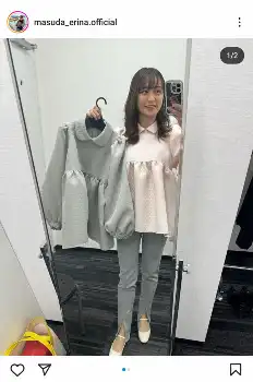 枡田アナは「今日の私服と今日の衣装」とつづり、ピンクのブラウスを着て色違いのグレーのブラウスを持ったパンツ姿を投稿。「色違い!!スタイリストのディスカスさんが、私の好みを熟知しすぎて、時折この現象が起きます…」と説明した。