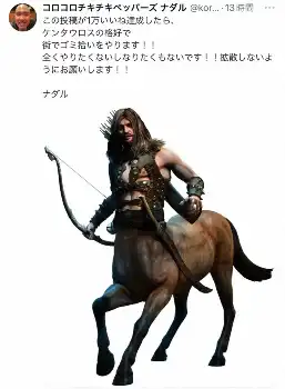 「この投稿が1万いいね達成したら」と目標を達成すると「ケンタウロスの格好で街でゴミ拾いをやります!!」と決意表明。