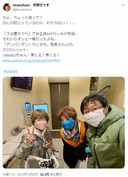 アニメ界では、8日に明らかになった鳥山明さんに続く、衝撃の訃報。「うる星やつら」のラム役で知られる声優の平野文は「ちょ、ちょっと待って!なにが起こっているのか、わからない・・」と動揺隠せず。「『うる星やつら』で女生徒Aからしゅがあ役。それからずっと一緒だったよね。『アンパンマン』のときも。和彦さんとの、この3ショット。TARAKOちゃん!見てる?見てる?」と呼びかけ。「美味しんぼ」の山岡士郎役、「NARUTO-ナルト-」シリーズのはたけカカシ役などで知られる声優の井上和彦を交えた生前のTARAKOさんとの3ショットを投稿した。