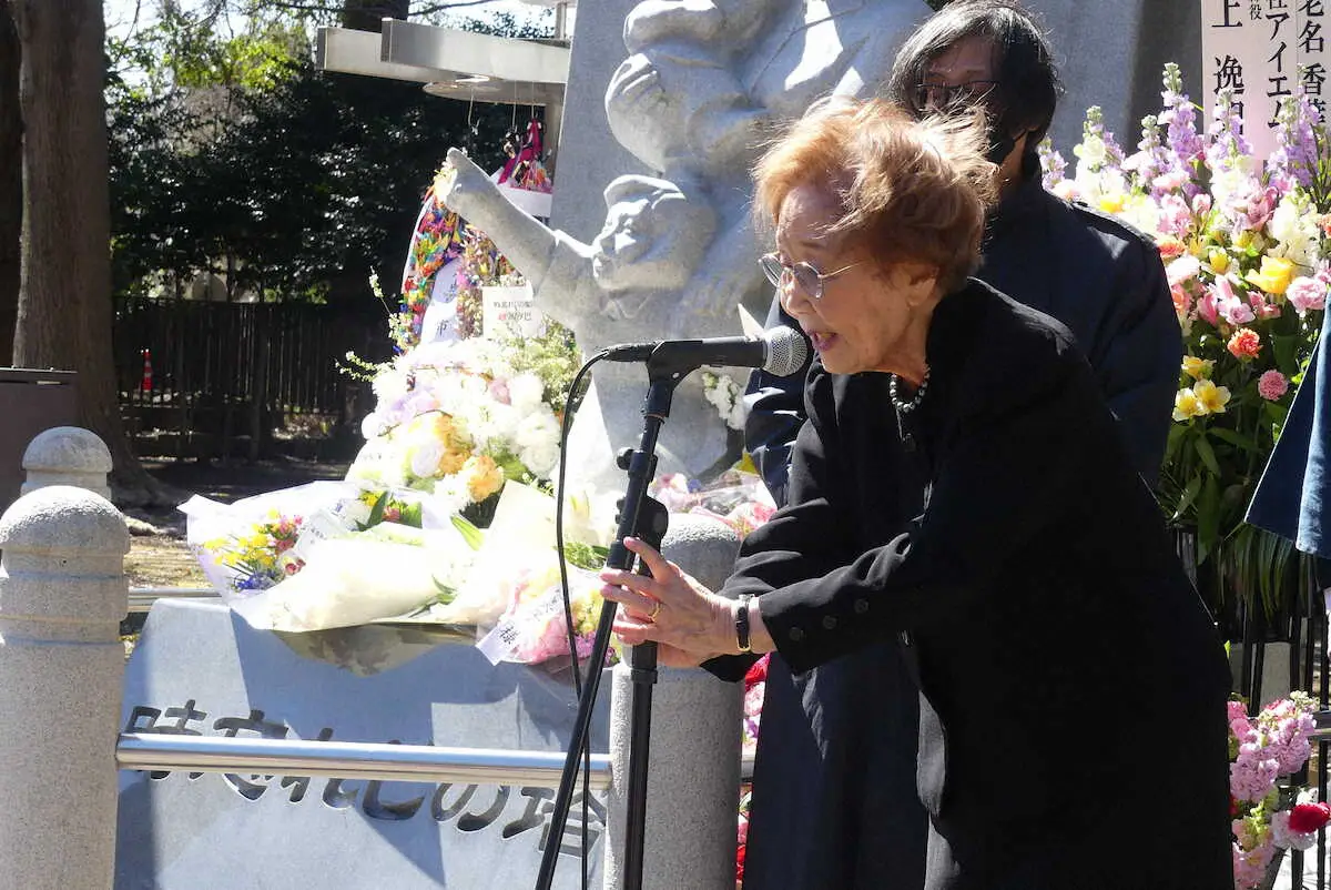 初代林家三平さんの妻で、エッセイストの海老名香葉子氏(90)が9日、上野の現龍院にある慰霊碑前で、空襲の惨禍を後世に伝える「時忘れじの集い」を開いた。