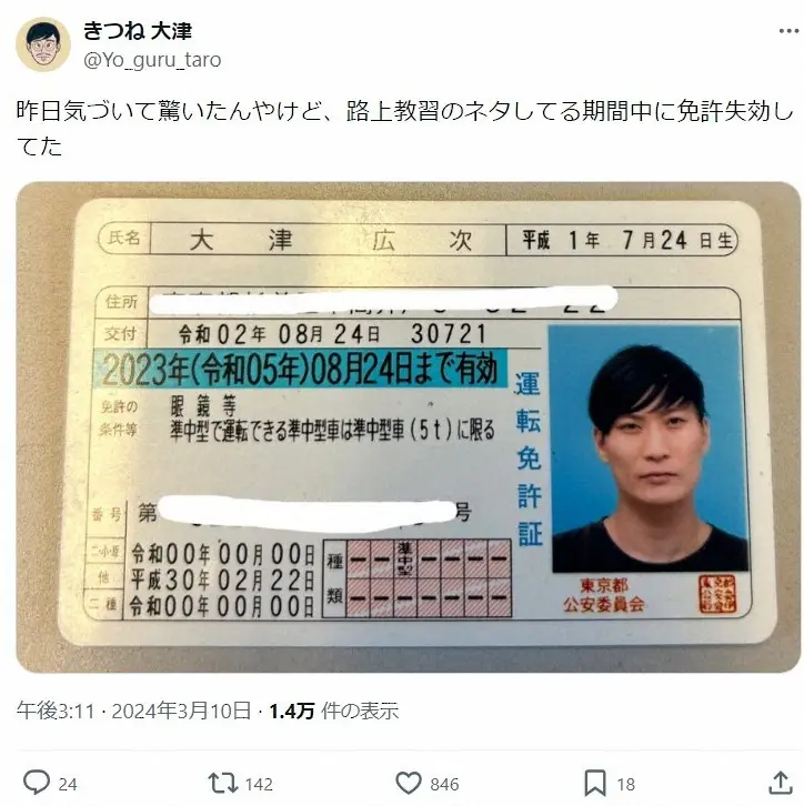 大津は、自身のX(旧ツイッター)で「昨日気づいて驚いたんやけど、路上教習のネタしてる期間中に免許失効してた」と記し、ファンからは「半年はやばいですよ」「免許再取得の峠を乗り越えてください…!」「どうなるんだろ?」「取り直しに行かないと、ですね」「タイミングがお笑いすぎます」などの声が寄せられている。
