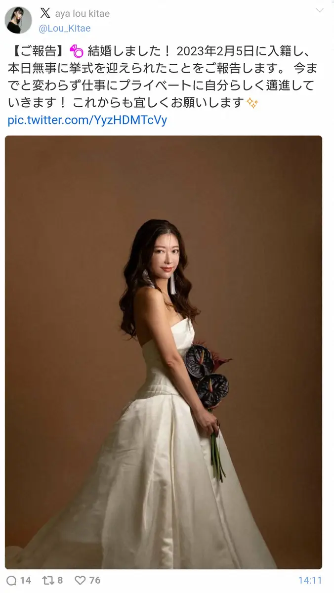 Xに【ご報告】と題して「結婚しました!2023年2月5日に入籍し、本日無事に挙式を迎えられたことをご報告します。今までと変わらず仕事にプライベートに自分らしく邁進していきます!これからも宜しくお願いします」と投稿した。