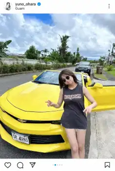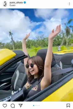 「Guam 写真集のオフショット 海外での初運転は最高でした」とつづり、タンクトップ&短パン姿で黄色いシボレーカマロ・コンバーチブルを運転している写真などをアップした。
