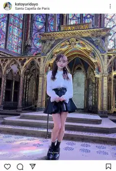 「サントシャペル行けてよかった」とつづり、パリのサントシャペル教会のステンドグラスをバックにしたミニスカート姿の写真や、セーヌ川をバックにした写真をアップした。