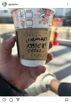 津田は「ありがとよ!あばよ!」とコメント。「いつもみてます!大好きです!ゴイゴイスー Enjoy!!(楽しんで)」と書かれたカップの写真を掲載した。