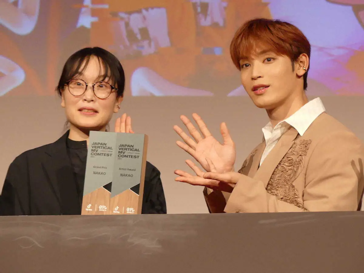 縦型映像コンテスト「JAPAN VERTICAL MV CONTEST」の授賞式にゲスト出席したJO1・與那城奨(右)。グランプリのNAKAOさんと