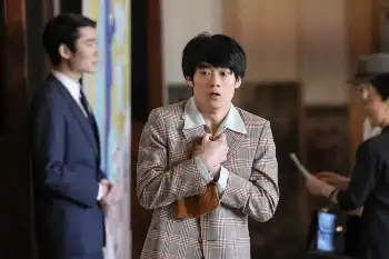 連続テレビ小説「ブギウギ」第115話。 日帝劇場・ロビーにて。お金を持つタケシの元へと向かってくる男(水澤紳吾)(C)NHK