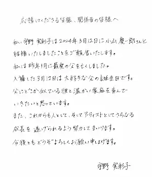 小山と宇野は、宇野の父の誕生日である3月12日に入籍。「大安」だった翌13日に発表した。年始のスポニチ本紙では、2人が年内結婚予定であることをスクープ。関係者によると、2人は知人を介して知り合い、長く友人関係だったが、22年秋に交際に発展。家族公認の仲となり、お互いの自宅を行き来して半同棲生活を送っていた。