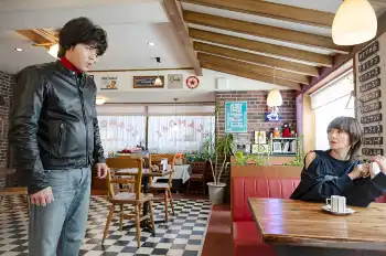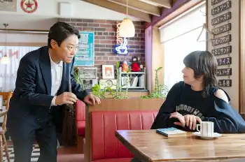 ラスト3分の令和パート、喫茶「SCANDAL」。ムッチは店内で文庫本を読む女性客が気になって仕方がない。歩み寄り「キョンキョンですか?」と声を掛ける。「ウソだあ」「だってキョンキョン、学年一緒だし」「ってことは、ドッペルゲンガー?えっ?」と目の前にいるのが小泉今日子(本人役)だとは、にわかに信じがたい。ムッチの反応に、小泉も驚く。