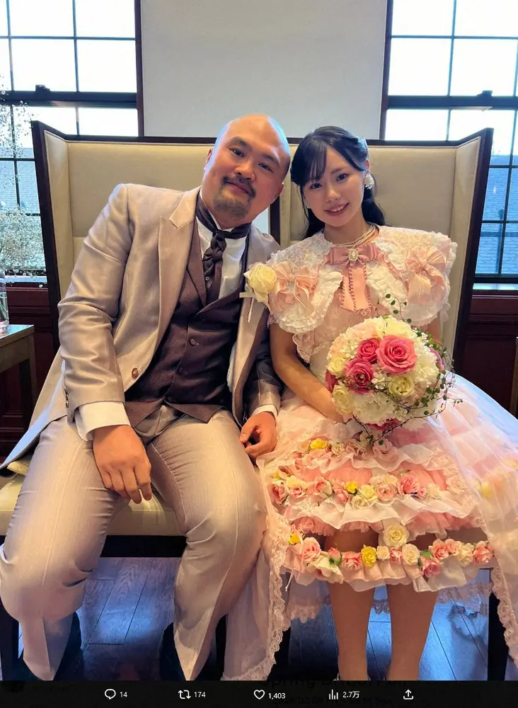 お笑いコンビ「鬼越トマホーク」の坂井良多(38)が15日、自身のX(旧ツイッター)を更新。妻で元アイドルの早乙女ゆみのさん(29)との結婚式でのショットを披露した。