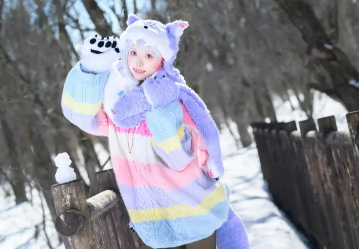 帽子やマフラー、手袋の紫色の部分は、この色のファー生地が見つからなかったため、染色しました。それぞれの裏地にはフリースを縫い付けて防寒対策としました。