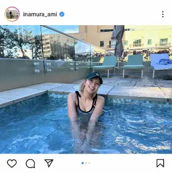 前投稿でハワイを訪れたことを明かしていた稲村は「ハワイでは海は寒くって入れなかったけどプールははいれた」と書き出すと、ボーダーの水着にキャップ姿でプールを楽しむショットをアップ。