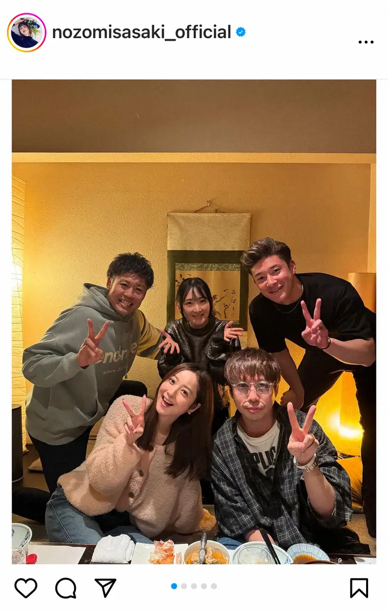 佐々木は「先日秋田に帰って、プチ秋田会」と同郷の仲間たちと会食した様子を公開。「それぞれの分野で頑張っている人達と楽しくワイワイご飯」とつづり、日本ハムからトレード移籍したオリックスの吉田輝星投手、バスケットボールの田口成浩選手(B1秋田)、シンガーソングライターの高橋優、女優の生駒里奈とのショットを披露した。