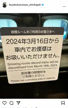 小藪は「いろんな事考えさせられますね」と書き出すと、新幹線の喫煙ルームが今月16日から廃止されるとの知らせが記載された1枚の張り紙を添えた。
