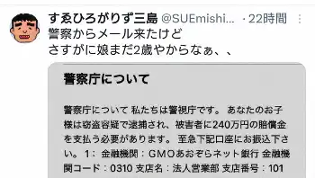 三島は「警視庁について」と書かれたメールの「警視庁です。あなたのお子様は窃盗容疑で逮捕され、被害者に240万円の賠償金を払う必要があります」などと書かれ、振込先の口座番号の書かれた画像を公開した。