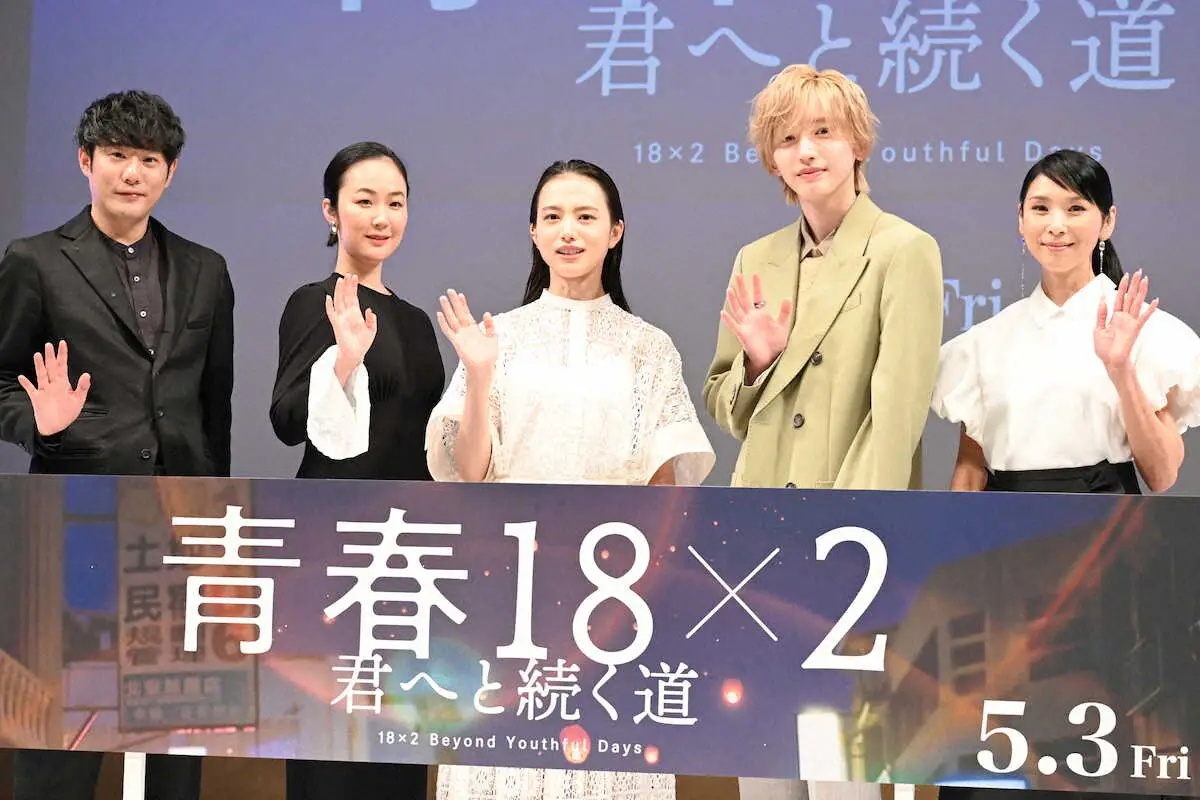 映画「青春18×2 君へと続く道」のジャパンプレミアに出席した(左から)藤井道人監督、黒木華、清原果耶、道枝駿佑、黒木瞳(撮影・糸賀日向子)