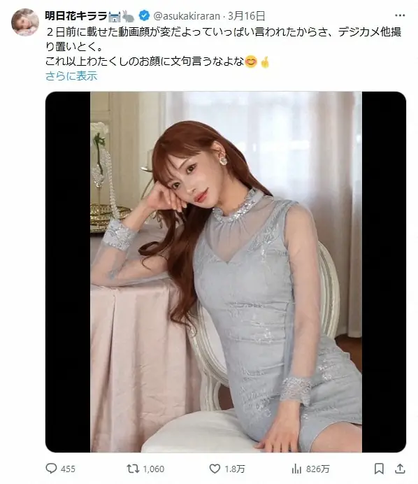 明日花キララのX@asukakiraranから 明日花キララに“顔が変だよ”コメント殺到…本人が反応「これ以上わたくしの… ギャラリーで見る この記事のフォト 2024年03月19日の画像一覧 もっと見る 2024年03月19日の画像をもっと見る