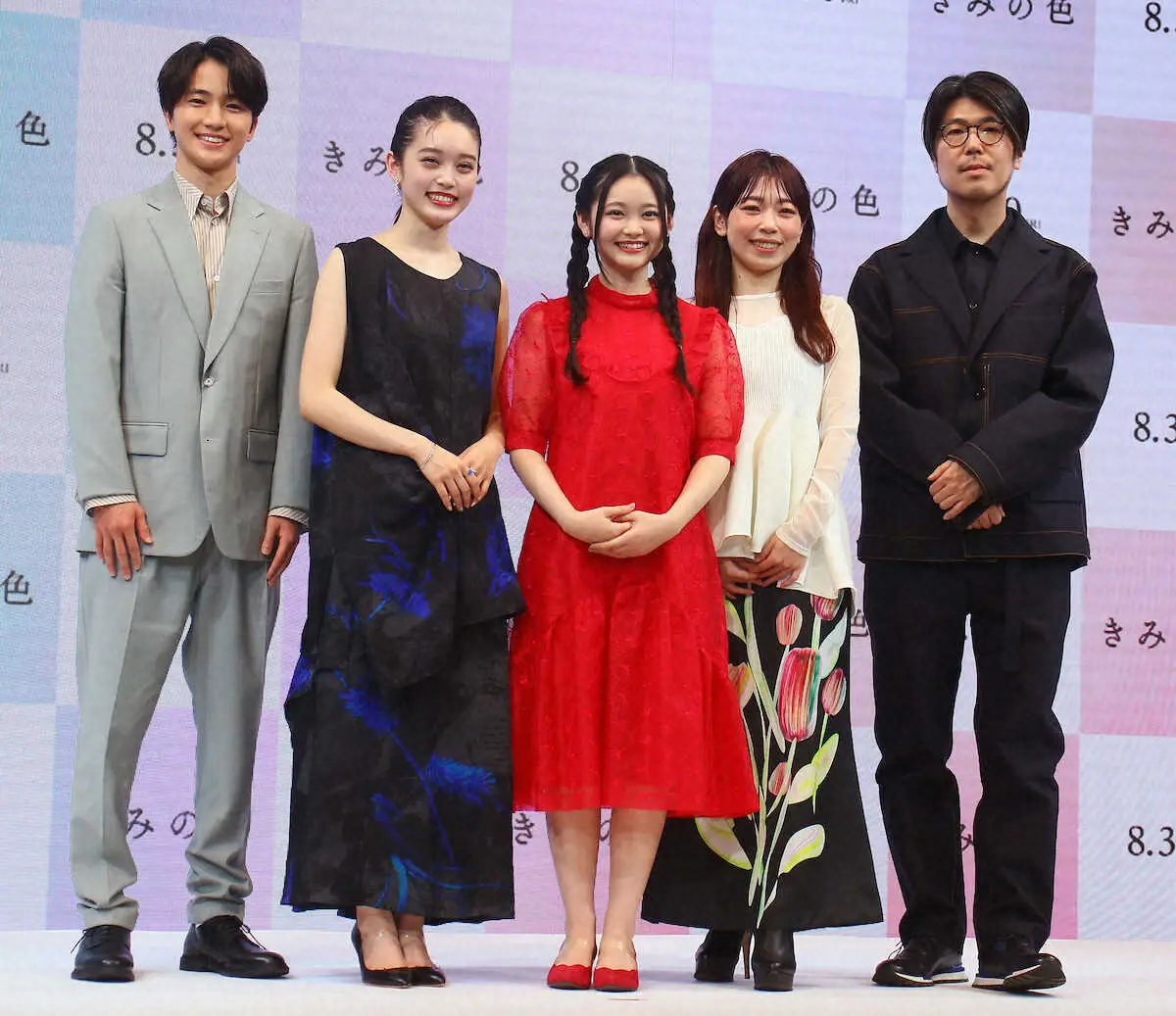 アニメ映画「きみの色」の製作報告会に出席した(左から)声優を務める木戸大聖、高石あかり、鈴川紗由と山田尚子監督、川村元気プロデューサー