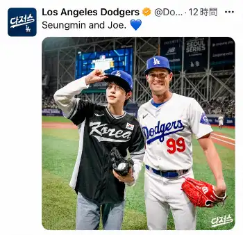 ドジャースの公式X(旧ツイッター)が19日までに更新され、前日18日のドジャースと韓国代表のエキシビションゲームで始球式を務めた8人組ボーイズグループ「Stray Kids」のスンミン(23)とジョー・ケリー投手(35)の2ショット写真を公開した。
