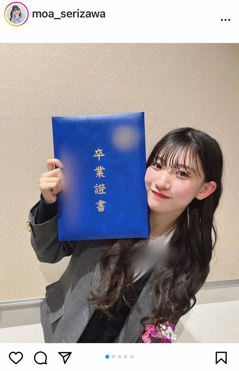 「可愛くてかっこいい2人にはいつも刺激をもらっていて、もあももっと頑張らなきゃ!ってなってました」と仲間たちに感謝。「高校卒業しましたが、これからも芹澤もあをよろしくお願いします!」と呼びかけた。