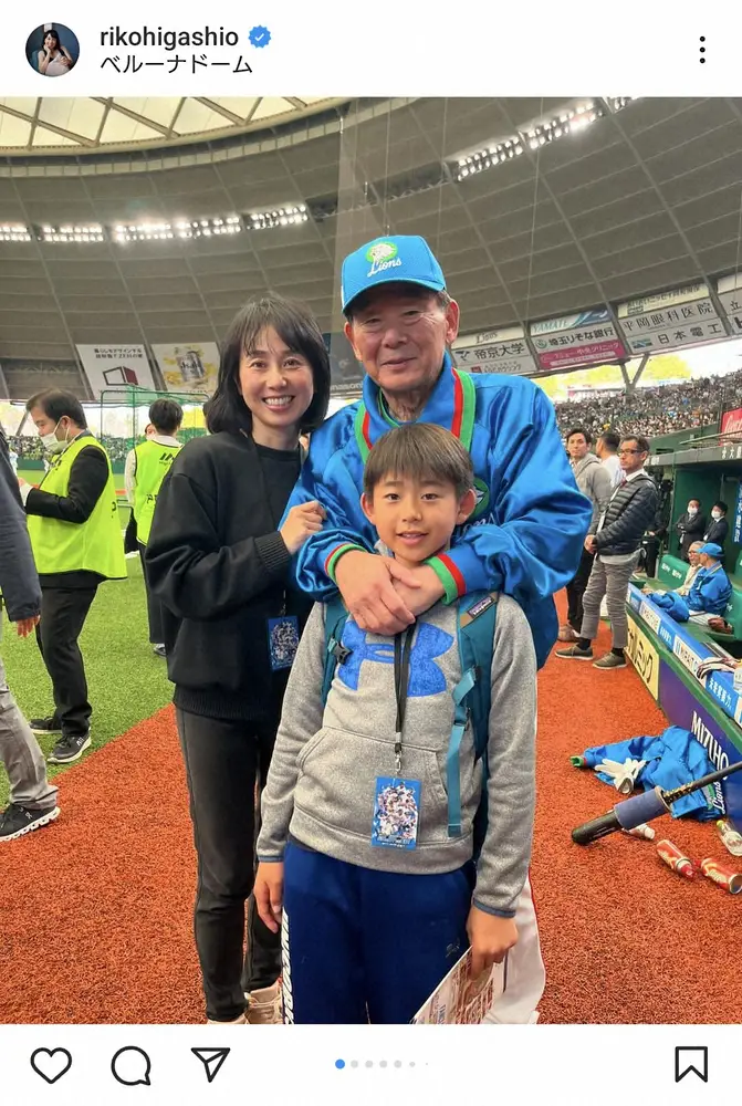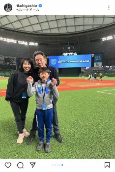 プロゴルファーでタレントの東尾理子(48)が20日、自身のインスタグラムを更新。プロ野球・西武の元監督で、野球評論家の父・東尾修氏(73)、長男・理汰郎くん(11)との3ショットを披露した。
